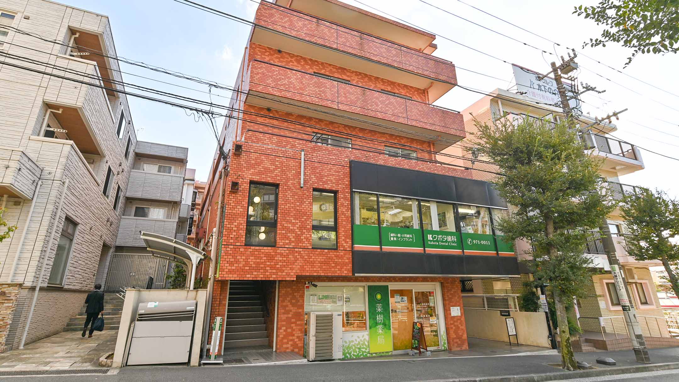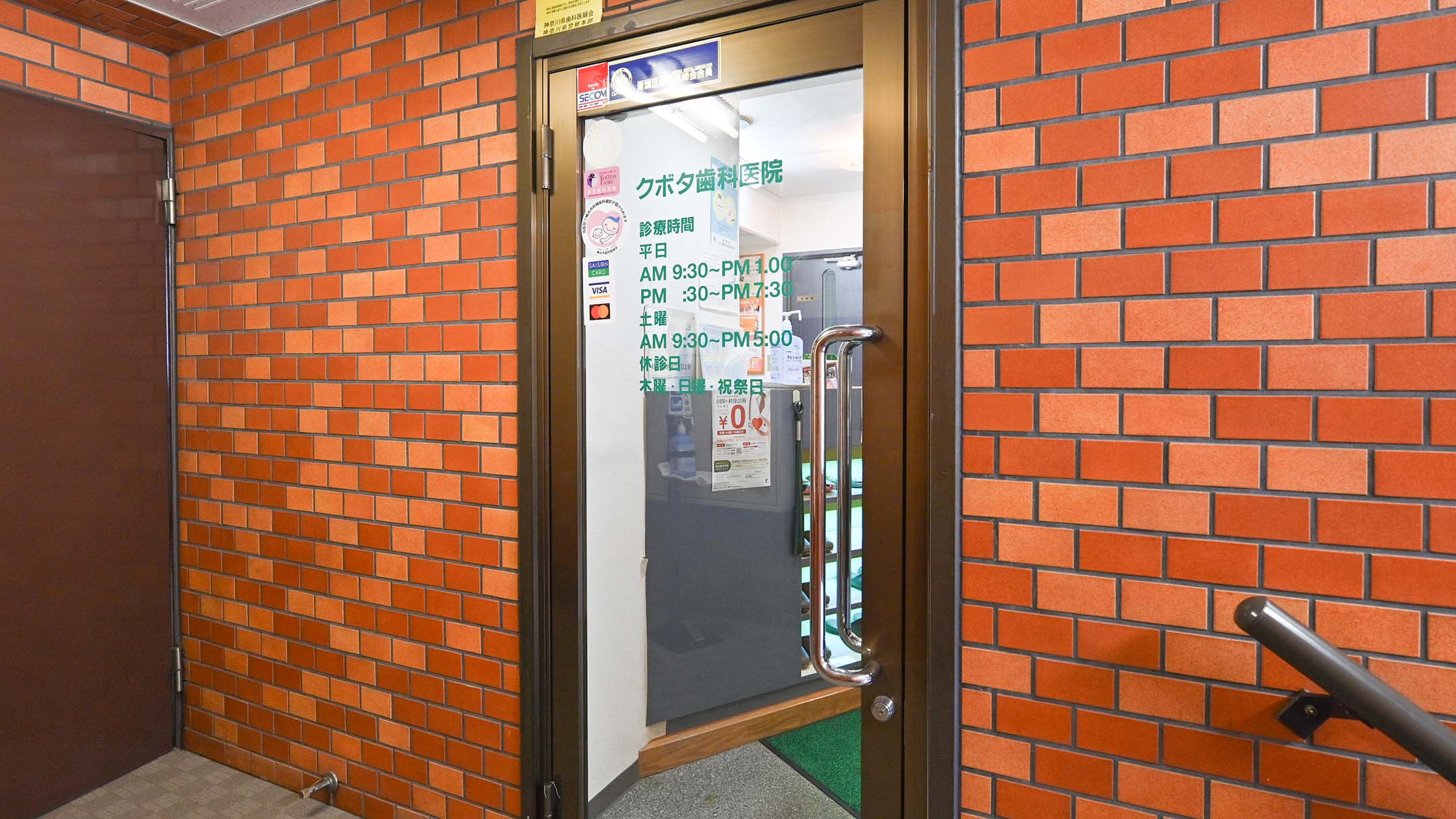 クボタ歯科医院の外観です。レンガ造りの壁が目印です。